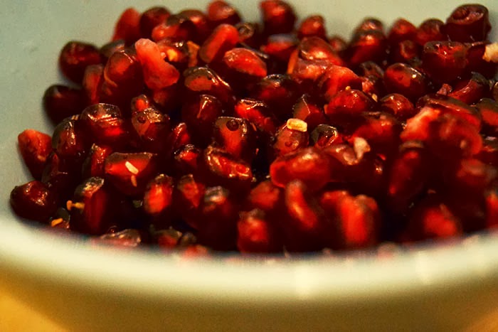 Smakade första gången granatäpple för drygt en månad sen. Hur i hela friden har jag missat den här dunderfrukten? Den är fylld med C-vitamin, fibrer och anitoxidanter och sägs i vetenskapliga studier ha effekt på bland annat åderförkalkning, cancer, artrit, inflammationer, blodpropp, benskörhet och tandköttsinflammation. Det enda negativa med granatäpple är att få ut kärnorna. Men så besökte jag min goda vän Madde för några veckor sen och hon instruerade mig i den ädla konsten.